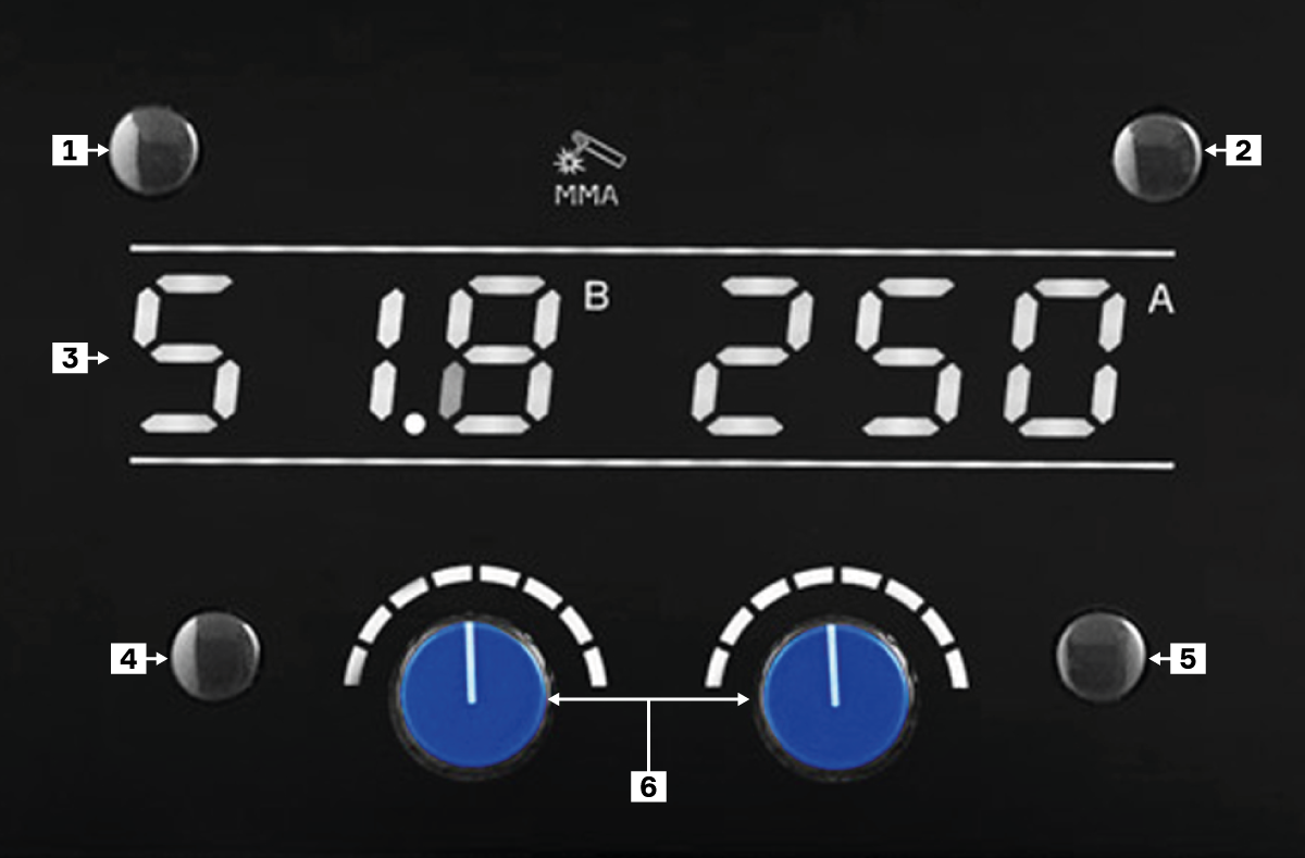 - Выбор сварочного режима: ММА / MAN / SYN / Lift TIG