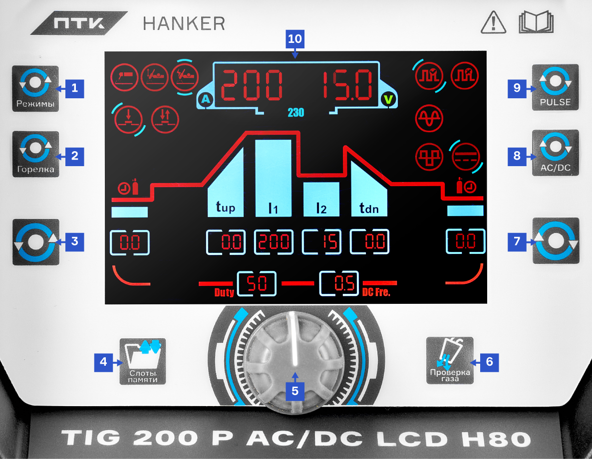 Функционал и настройки аппарата ПТК HANKER TIG 200 P AC/DC LCD H80