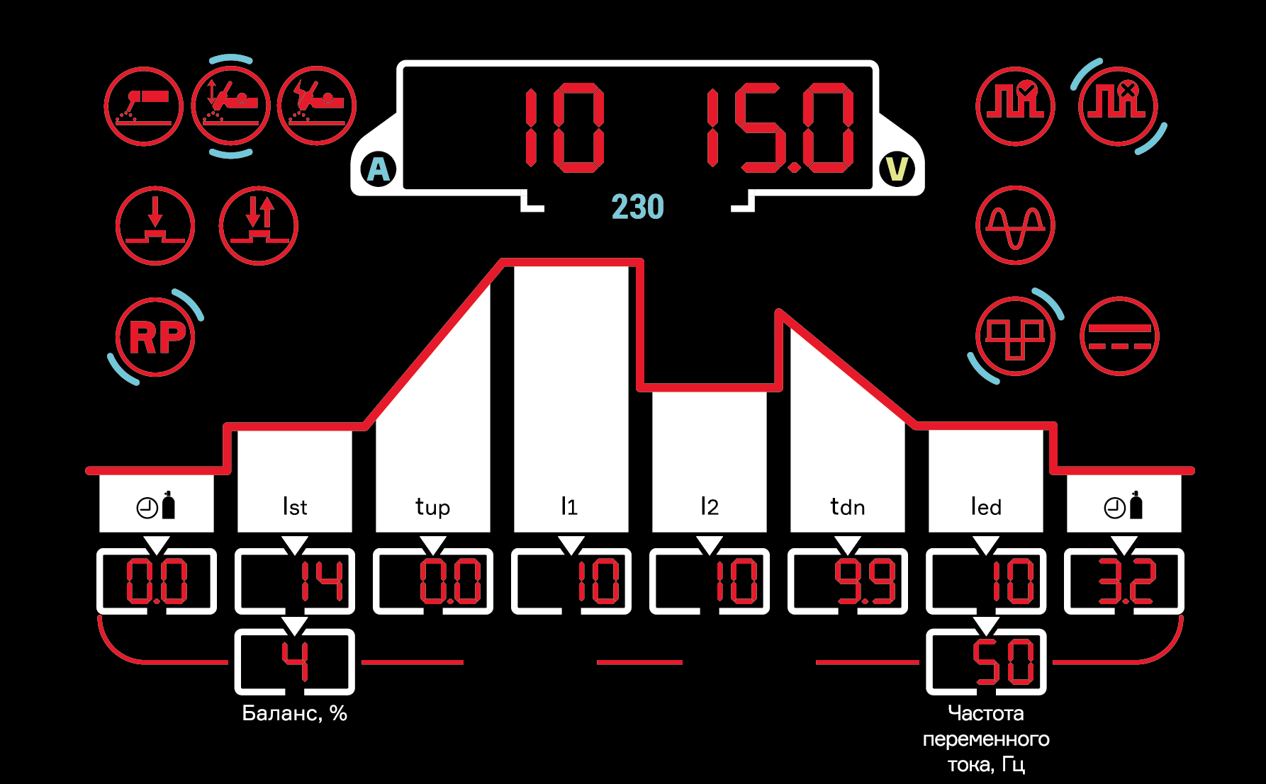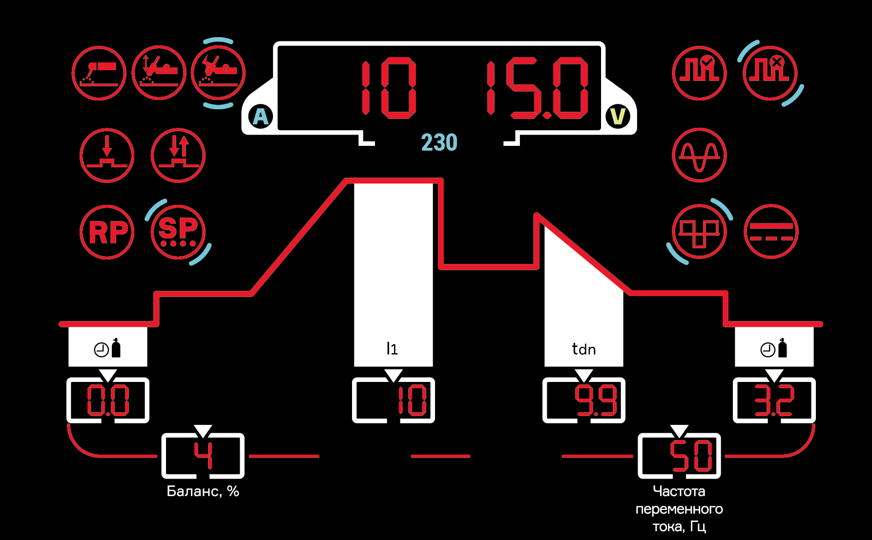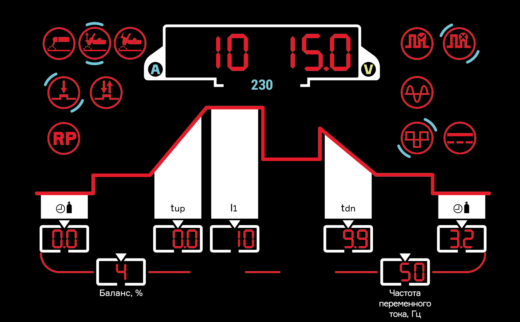 - RP (Repeat) – режим циклического повторения сварочной циклограммы