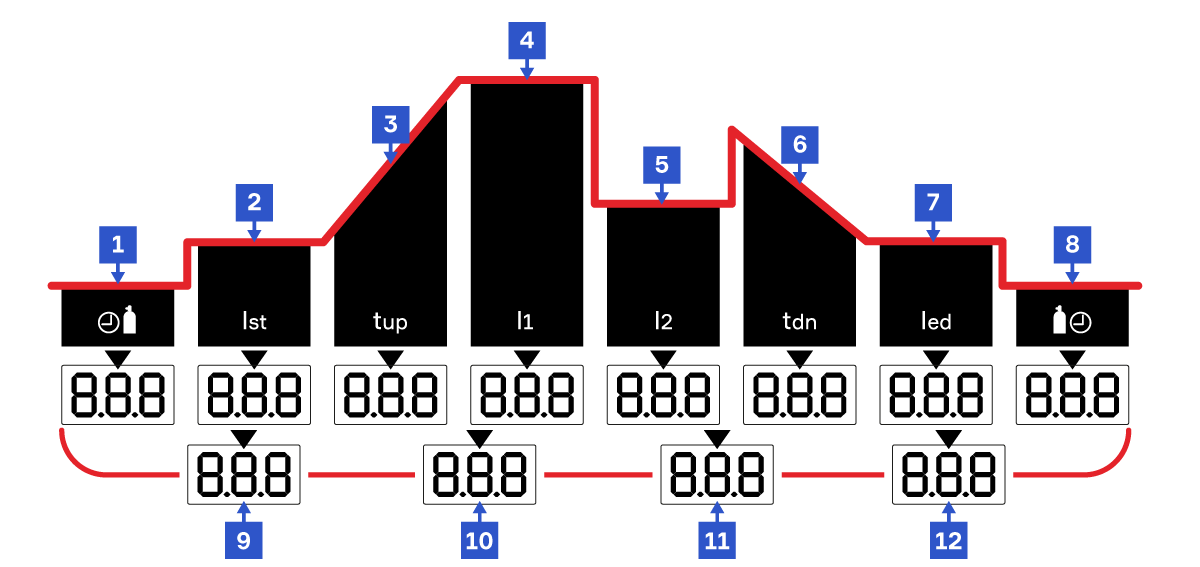 - Время нарастания тока (tup) – диапазон регулировок от 0,0 до 10,0 сек., шаг 0,1 сек.
