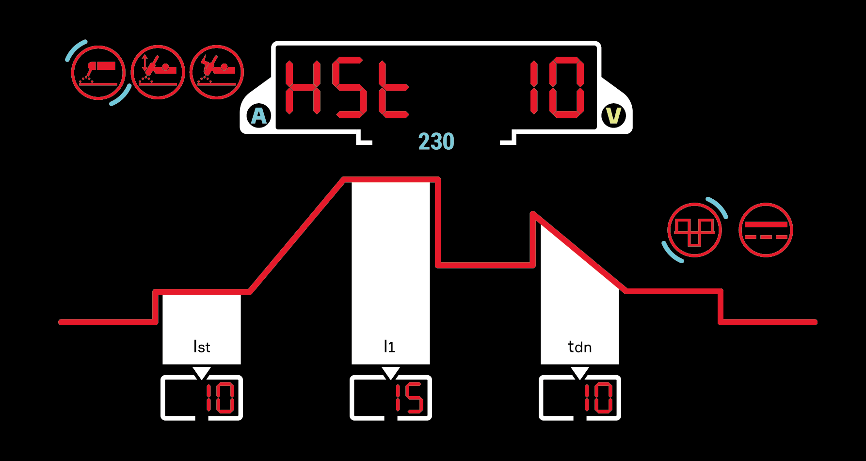 - Ток заварки кратера (Ied) – диапазон регулировок от 10 до 200 Ампер, шаг 1А.