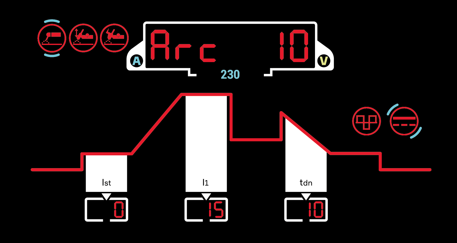 - Tdn (Arc) – Форсаж дуги. Диапазон регулировок от 0 до 10.