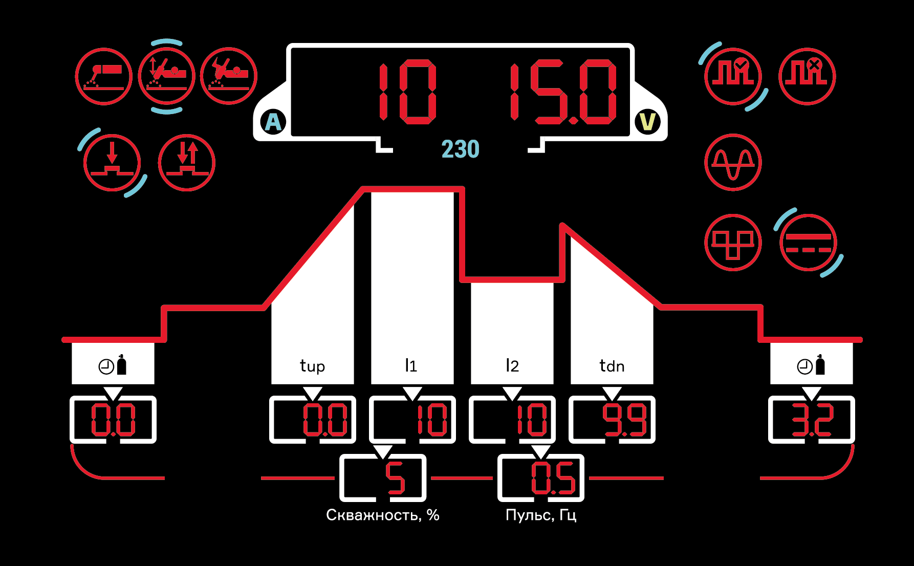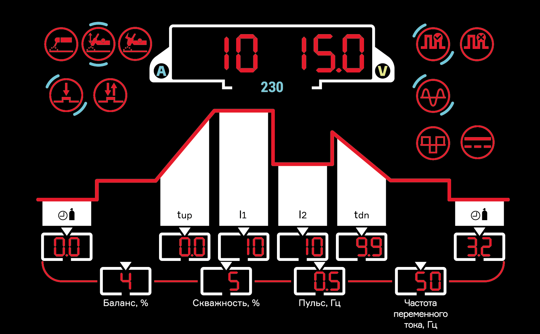 В режиме можно сваривать в токах АC и DC. Для тока AC PULSE доступны две формы волны – синусоидальная и квадратная. В режиме DC PULSE – стандартный пульс и отсутствуют регулировки Баланса, Частоты переменного тока.