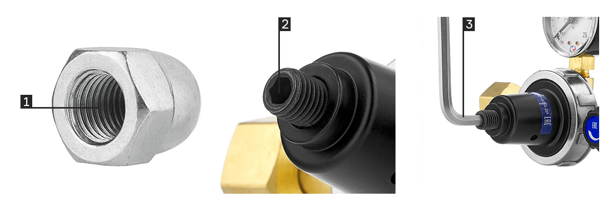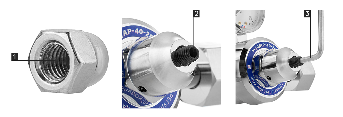 - После достижения требуемого расхода газа регулировочный узел закрывается фиксирующей гайкой.