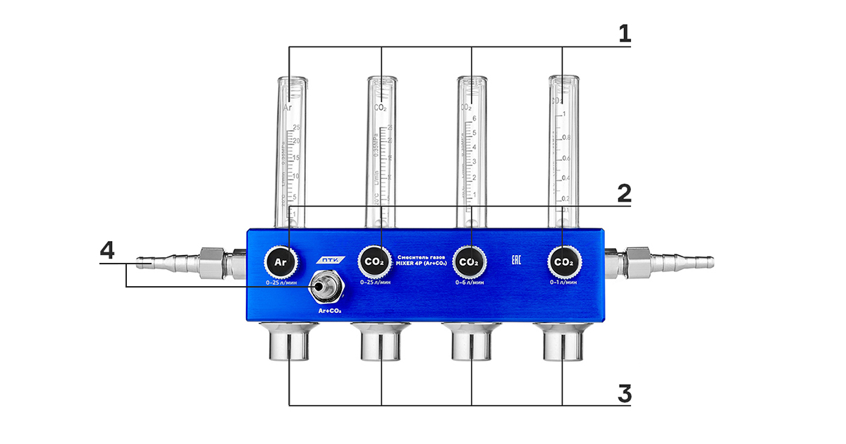 Новый смеситель газов MIXER 4Р (Ar+CO₂) c 4 ротаметр-колбами
